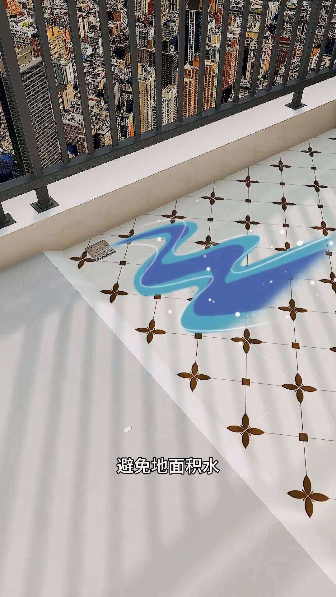 在两边铺设不同款式的地砖,这样能更好地划分区域。敞开的那一侧要做好防水处理,衔接之处预留3公分的斜坡,地面预先设置地漏,防止地面积水和返潮。