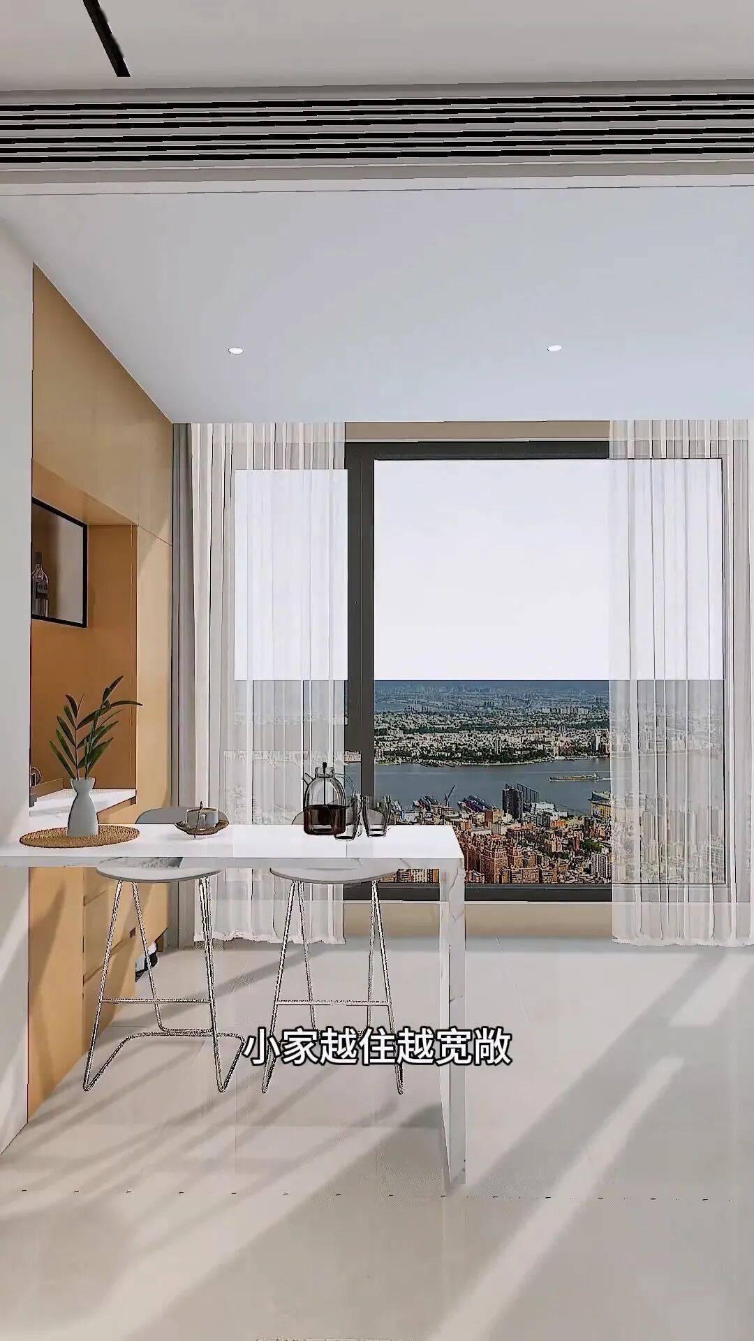 将封闭起来的这一侧作为收纳区,定制一整面墙的家政柜,把闲置物品和日常囤货都存放在这里。还可以嵌入扫地机器人,台面上放置一个茶吧机,瞬间就能变成精致的水吧台,玻璃柜专门用来收纳饮料和酒水。