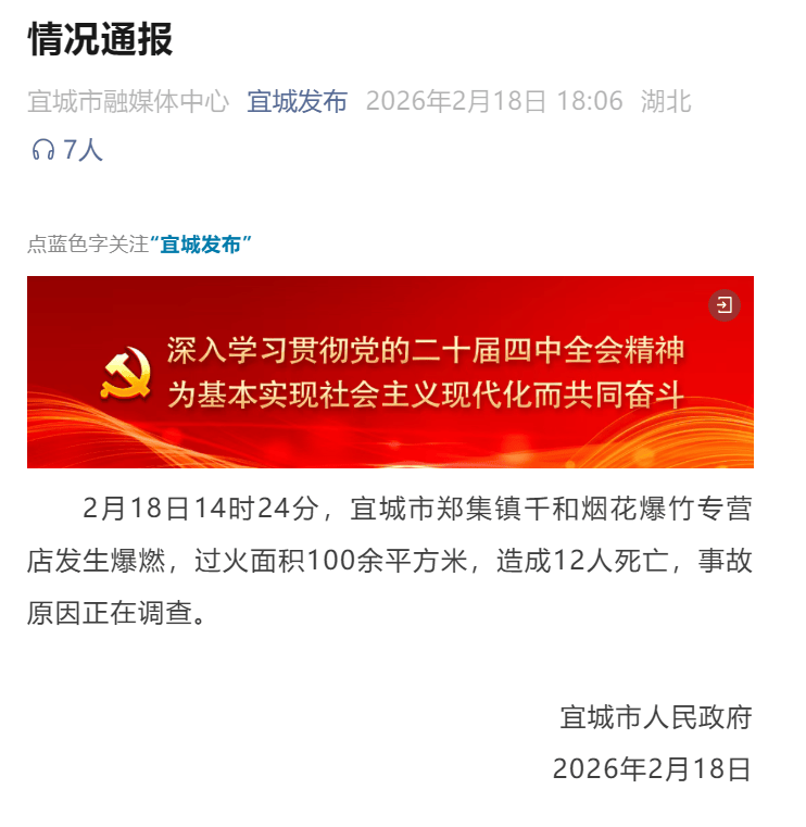 央广网襄阳2月18日消息(记者邓子依)2月18日,宜城市人民政府发布情况通报:2月18日14时24分,宜城市郑集镇千和烟花爆竹专营店发生爆燃,过火面积100余平方米,造成12人死亡,事故原因正在调查。