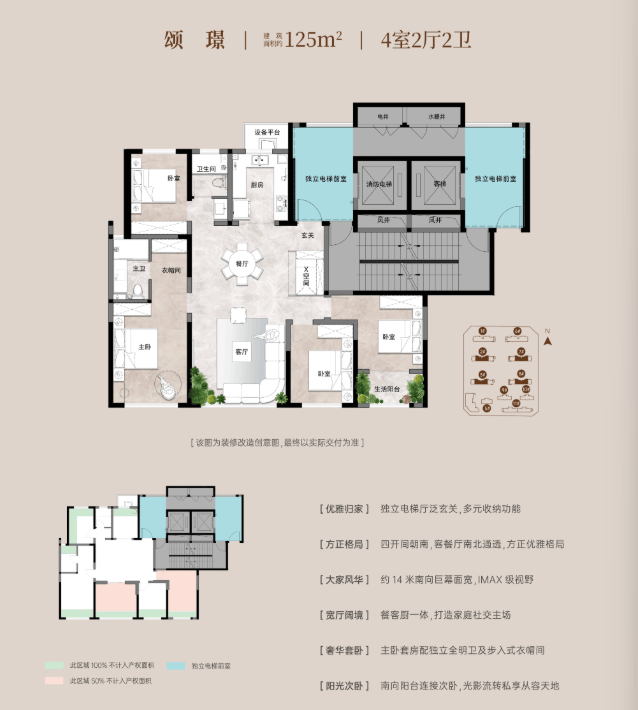 高层产品采用2梯2户设计,最大亮点在于端户拥有约20㎡全赠送的层层露台,实现最高约120%的空间效能(含电梯厅)。约6米层高的露台和约18.3米南向面宽,带来270°环幕视野与极致采光,重新定义了主城平墅的居住体验。