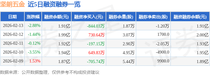 证券之星消息,截至2026年2月13日收盘,坚朗五金(002791)报收于23.92元,下跌2.88%,换手率3.76%,成交量7.2万手,成交额1.74亿元。