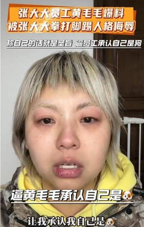 张大大不仅用枕头、玻璃杯砸他,还在他弯腰捡被摔碎的电脑时,一脚把他踹倒在地,之后还强迫他弯腰90度鞠躬道歉,反复喊“大哥对不起”,甚至逼着他承认“自己是一条狗,连屎都不如”。