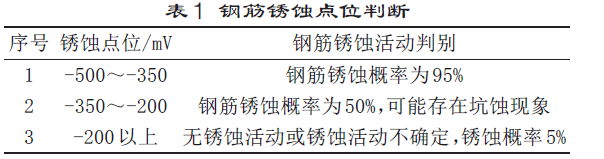 环境因素对混凝土结构耐久性的影响主要包括两个方面。一是混凝土结构所处的环境,二是混凝土拌合物搅拌运输条件。该工程混凝土结构所处的环境类别为2a,地下水丰富、非严寒和寒冷地区,不受冻融影响。商品混凝土从搅拌站运输到施工现场时需要一定的时间,当气温比较高时,混凝土到达施工现场时塌落度损失可能比较大,现场浇筑时流动性变差,甚至会导致混凝土发生离析等,影响构件耐久性能。夏季丰雨期,地下水位高于地下室底面,混凝土浇筑过程如果振捣不密实会有地下水汽渗到混凝土构件里面,导致混凝土的电阻率降低,钢筋产生电位差,使钢筋发生锈蚀活动,危害结构安全。根据表1可知,电位差越大,钢筋锈蚀活动越大。在塔楼地下室结构建成后,我们根据现场实际情况对塔楼地下室主主梁和顶板进行锈蚀点位检测,检测结果均为-200mV以上,混凝土构件未发生明显锈蚀活动,地下室结构稳定,未发现因锈蚀活动造成混凝土使用安全问题。