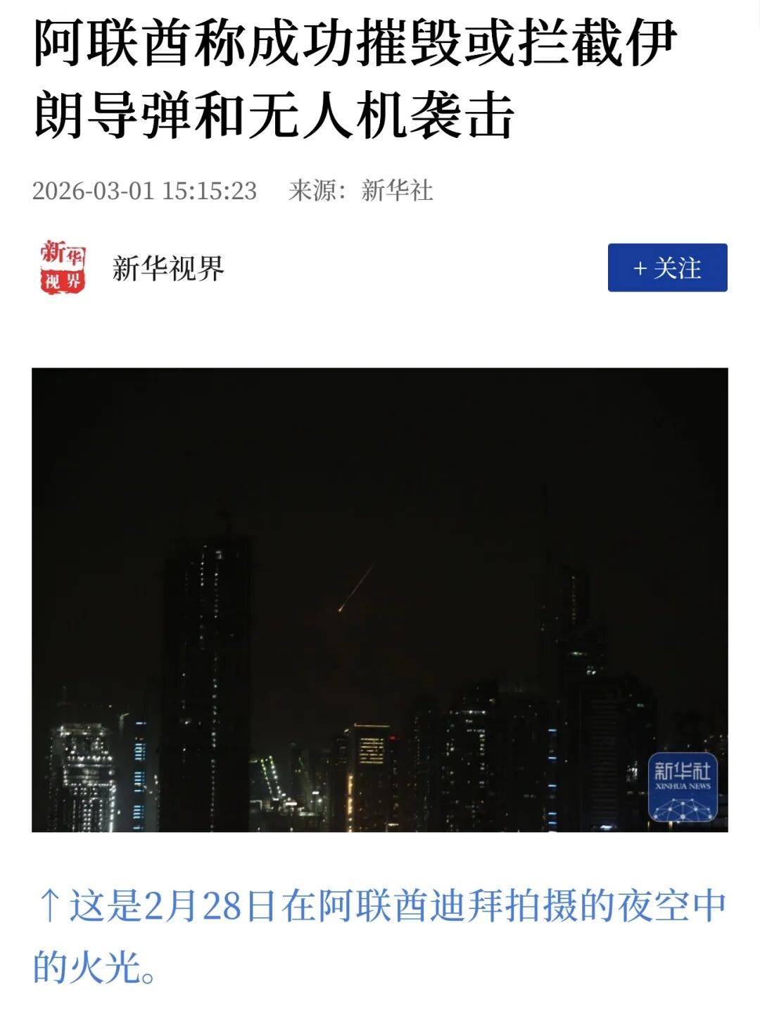 综合阿联酋国防部声明及多家外媒报道,伊朗朝阿联酋方向发射的137枚导弹和209架无人机中大部分被摧毁或拦截。遭拦截的导弹碎片溅落在迪拜和阿联酋首都阿布扎比,导致至少1人死亡。