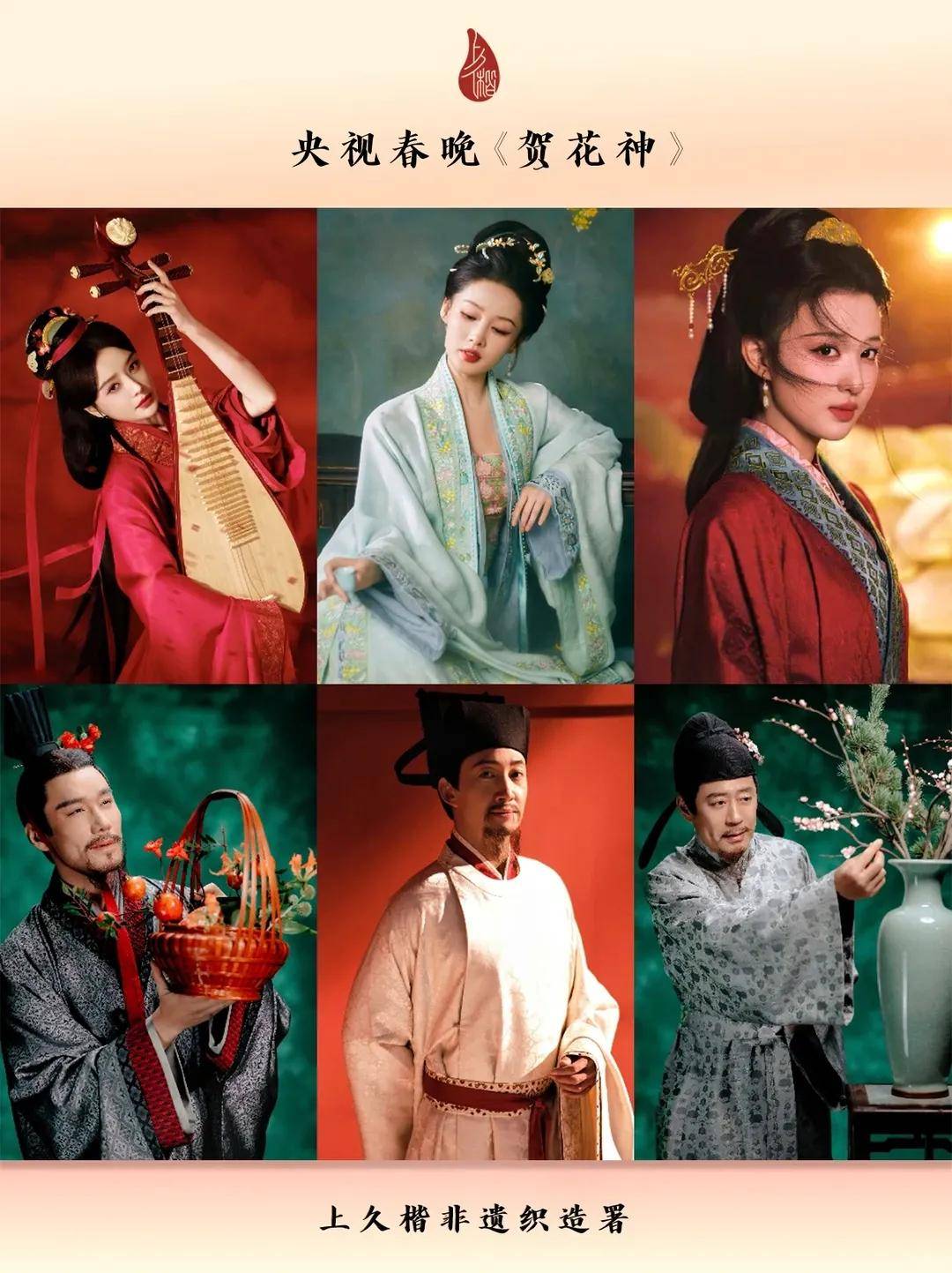 春晚节目《贺花神》中,刘昀(二月杏花花神陆游)、秦岚(三月桃花花神息夫人)、胡兵(五月榴花花神张骞)、王阳(六月荷花花神周敦颐)、李沁(九月桂花花神李清照)、王楚然(十月芙蓉花神王昭君)六位演员的舞台华服,均由国家级非遗宋锦织造技艺打造而成。春晚主持人尼格买提以及周传雄、胡先煦等演员的服饰,亦融入了宋锦元素。