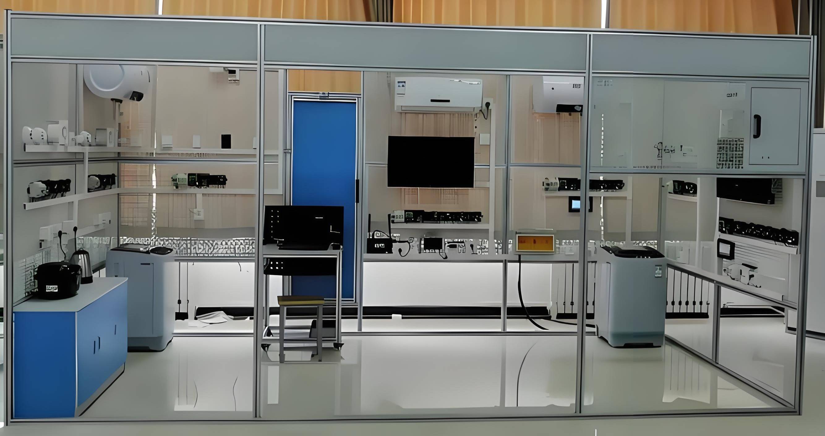 智能家居实训系统为一套标准两室一厅智能家居实验平台。应包含七大家庭控制中心(门庭控制中心、客厅控制中心、厨房餐厅控制中心、卫生间过道控制中心、主卧室控制中心、次卧室控制中心、阳台控制中心),以及一套智能家居管理软件。七大家庭控制中心通过以太网与家庭信息互联处理中心联系,达到家庭安全防护系统、网络服务系统和家庭自动化系统组成的家庭综合服务与管理集成系统的目的,从而实现全面的安全防护、便利的通讯网络以及舒适的居住环境的家庭住宅。