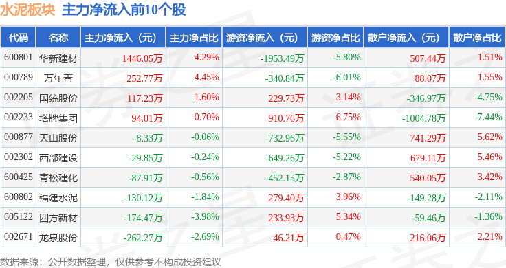 从资金流向上来看,当日水泥板块主力资金净流出2.12亿元,游资资金净流出1054.1万元,散户资金净流入2.23亿元。水泥板块个股资金流向见下表: