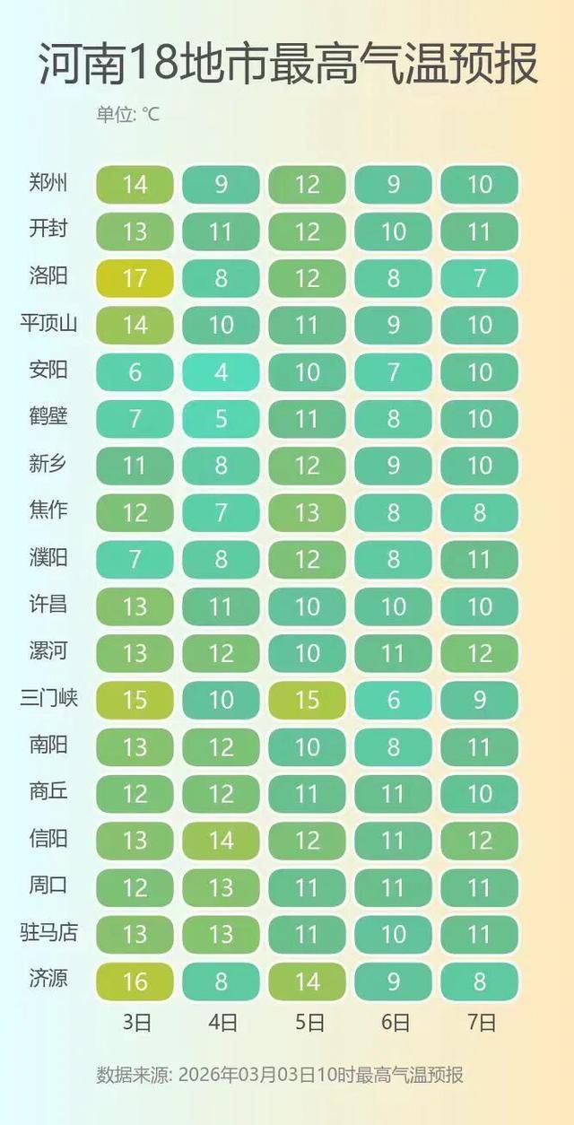 省会郑州紧随全省天气节奏,3月4日多云间阴天,有零星小雨,5日转晴,6日再度转阴,气温平稳起伏,日常穿搭无需大幅调整。