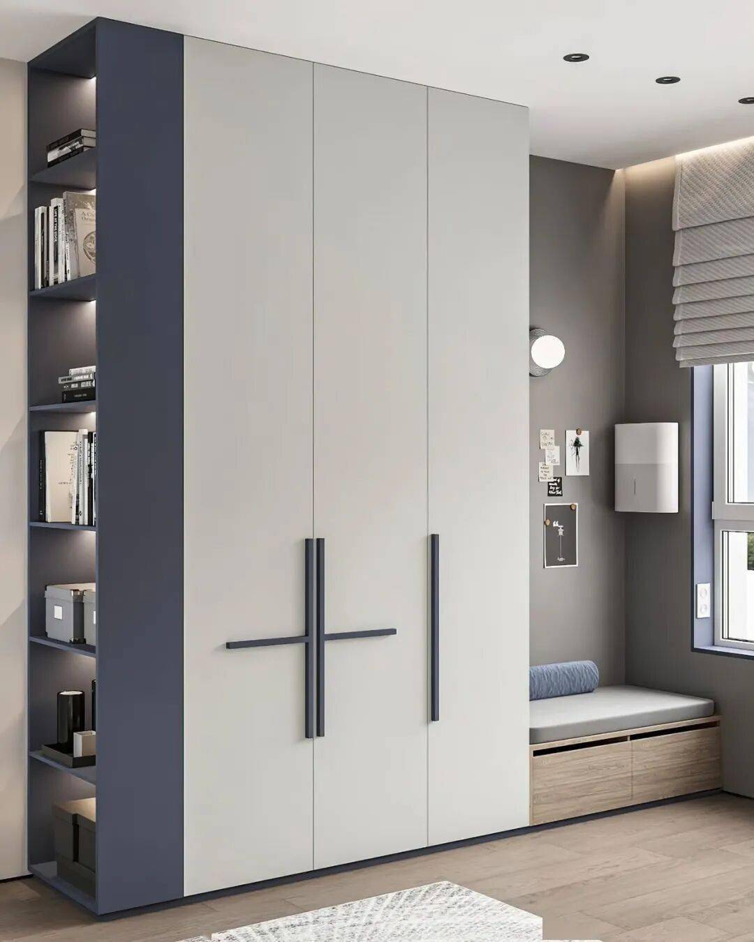 现代简约风主打无把手或极简长拉手,门板平整利落,像浅灰、米白的无框衣柜,搭配金属长拉手,利落又高级,小户型也能显得开阔通透。