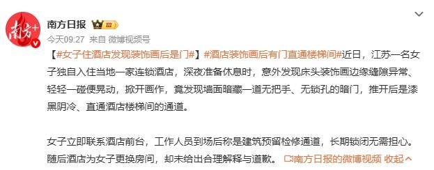 女子立即联系酒店前台,工作人员到场后称是建筑预留检修通道,长期锁闭无需担心。随后酒店为女子更换房间,却未给出合理解释与道歉。