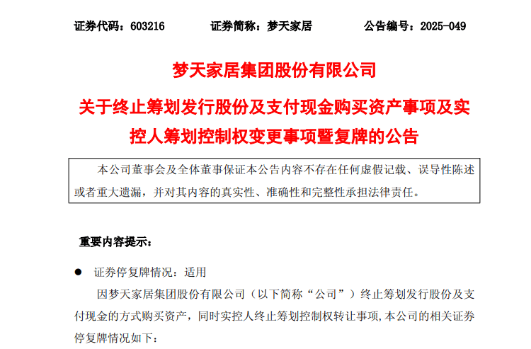 2025年11月18日,梦天家居(603216.SH)发布公告,宣布终止筹划发行股份及支付现金购买上海川土微电子股份有限公司控制权事项,同时终止实控人余静渊的控制权转让计划。