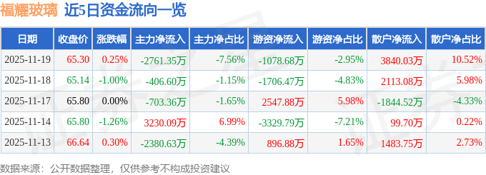 证券之星消息,截至2025年11月19日收盘,福耀玻璃(600660)报收于65.3元,上涨0.25%,换手率0.28%,成交量5.59万手,成交额3.65亿元。