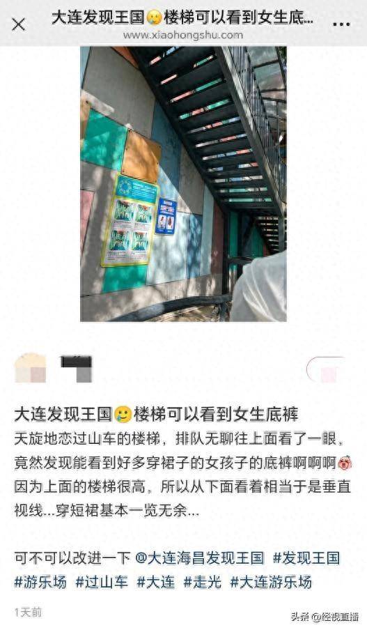 近日,有网友发帖称,在大连海昌发现王国主题公园游玩时,网友发现园内一过山车的楼梯采用镂空设计,从下方仰视时,甚至可看到女性游客的隐私部位。涉事景区、大连市文化和旅游局,均表示将核实情况并积极处理。记者注意到,该话题迅速引发众多网友热议。评论区中,有网友表示去年曾在同一地点遭遇偷拍并报警。