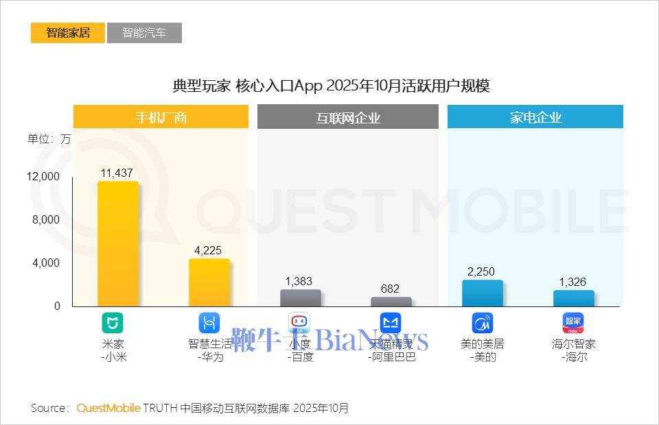 智能家居方面,2025年10月智能家居类App用户规模达3.83亿,月人均使用次数60.7次,同比分别增长14.3%、8.0%。从10月份月活用户规模来看,小米米家月活1.14亿,华为智慧生活月活4225万,百度小度智能音箱月活1383万、阿里巴巴天猫精灵智能音箱月活682万,美的美居月活2250万、海尔智家月活1326万。