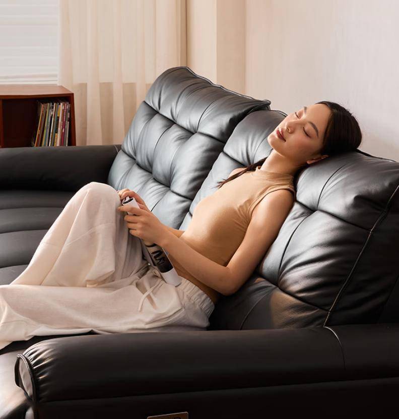 京造这款“大黑牛”沙发,名副其实,主打一个宽敞霸气!3.1米的超长尺寸提供了无与伦比的坐卧空间,随意翻滚、躺平都不是问题。其核心用料毫不妥协,采用全头层牛皮覆盖,确保接触面的每一寸肌肤都能感受到天然皮革的细腻、柔韧和卓越透气性,经久耐用且历久弥新。黑色经典永不过时,适配各种风格。它不仅仅是个沙发,更是一个多功能舒适岛。强大的电动功能支持多角度调节,轻松切换坐、靠、躺模式。其宽大的座深甚至可以临时充当单人床使用,满足偶尔留宿或深度放松的需求。整体造型敦实厚重,给人满满的安全感和包裹感,非常适合喜欢慵懒放松、追求极致空间感和真皮质感的用户,是客厅里当之无愧的舒适堡垒。