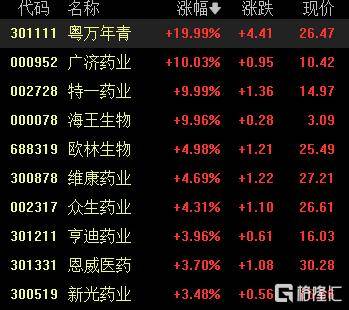 流感概念震荡走强,粤万年青20CM涨停(2连板),广济药业(4连板)、特一药业(3天2板)10CM涨停,众生药业、新光药业等跟涨。