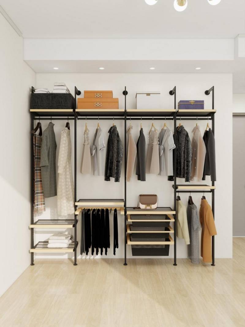 我选的是哑光黑碳钢柜体,搭配金属挂钩,和家里的床、灰色墙面完美呼应,老公还特意在衣柜侧面装了小射灯,晚上打开灯,挂着的大衣像在服装店展示区一样;闺蜜家是奶油风,选了浅灰色纳米喷涂款,和墙面乳胶漆颜色几乎一致,还加了透明网柜放包包,每次拍照都能拍到这个 “氛围感角落”。而且细节特别显高级:纳米喷涂工艺摸起来是细腻的磨砂感,不会留指纹;金属配件是哑光款,不像亮面那样显廉价,不管家里是极简风、轻奢风还是北欧风,都能无缝融入。