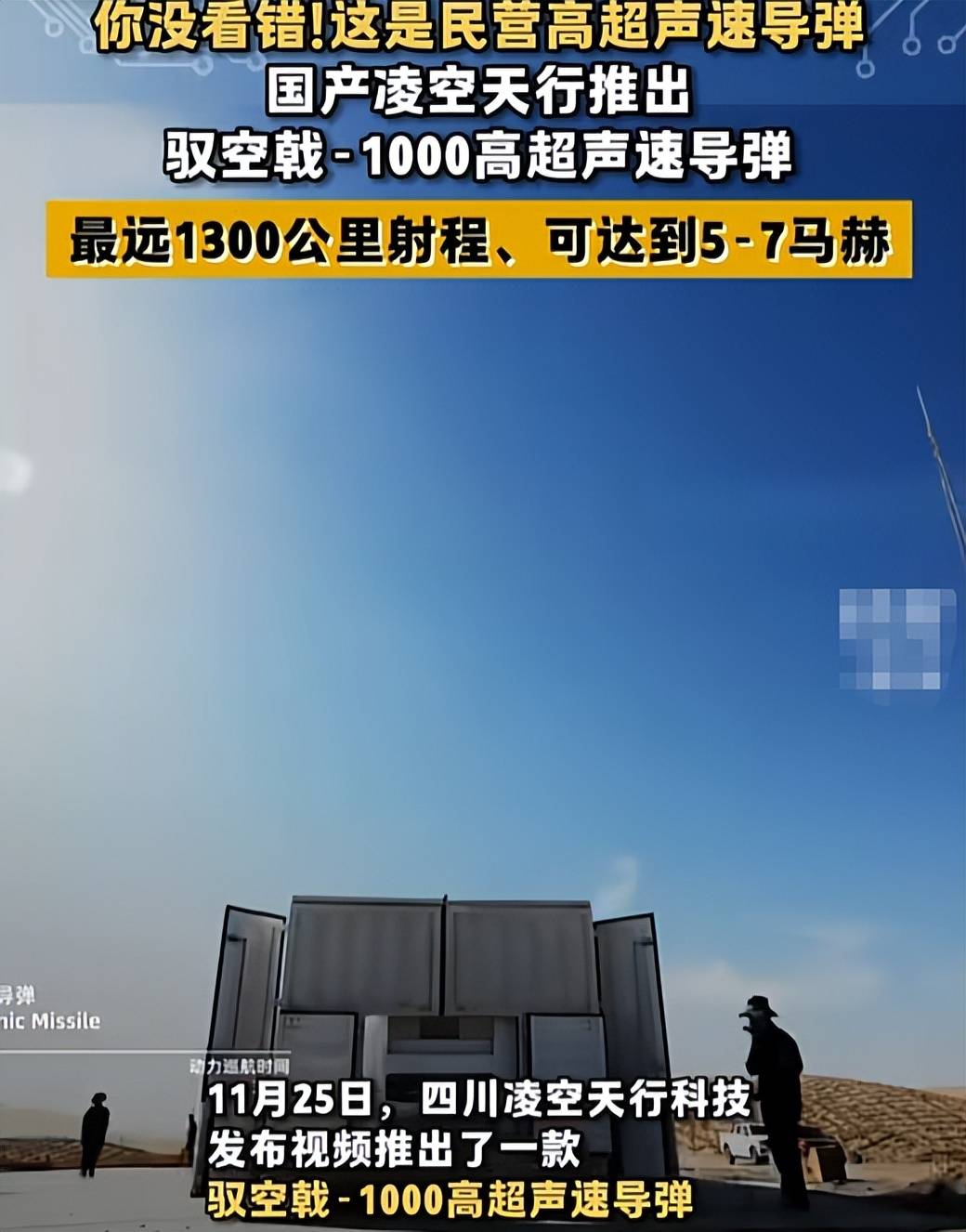 民企跨界造导弹 根据《国防邮报》等多家外媒在11月26日的报道,北京一家民营航空企业——凌空天行,正式宣布他们自主研发的高超音速导弹驭空戟-1000已经完成定型并进入批量生产。这并不是传统军工巨头的作品,而是中国第一款由民营公司研发并实现量产的高超音速导弹,可谓开了先河。