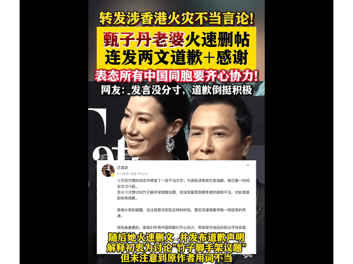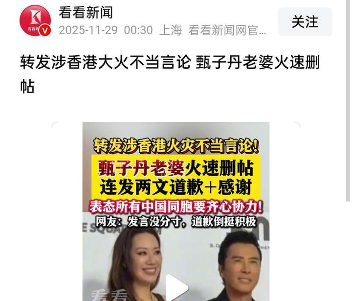 消息来源:《看看新闻》11月29日报道《转发涉香港大火不当言论 甄子丹老婆火速删帖》