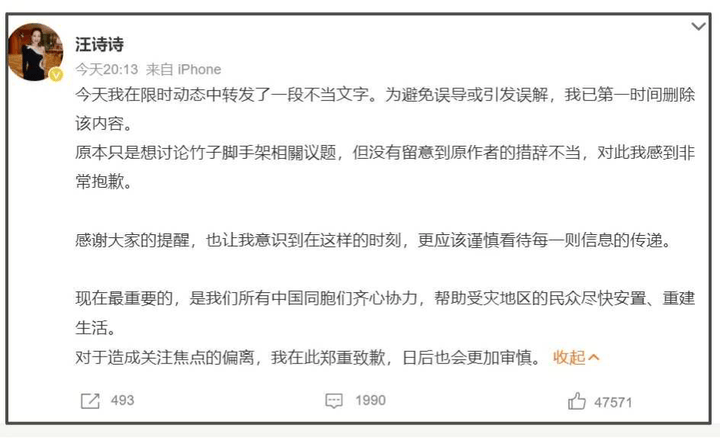 而某些公众人物,在未核实事实、未等待官方调查结果的情况下,便转发此类言论,这是一种不负责和有误导性的表现。好在汪诗诗不久后便删除了所发内容,并且对此发文道歉,称意识到原作者措辞不当,也说明原作者的确有转移话题和焦点的倾向,妄图造成对立,这是很不应该的。