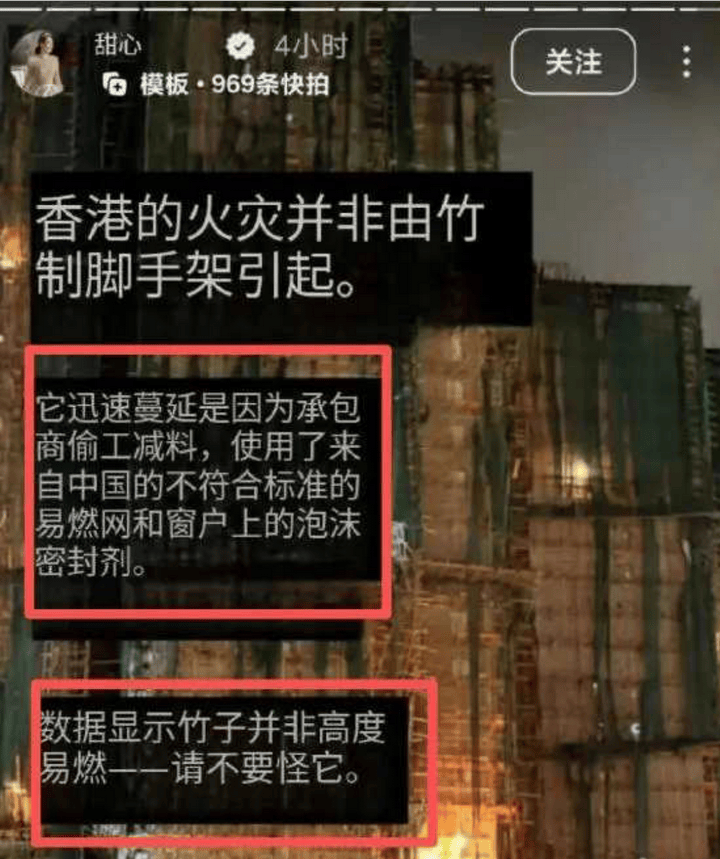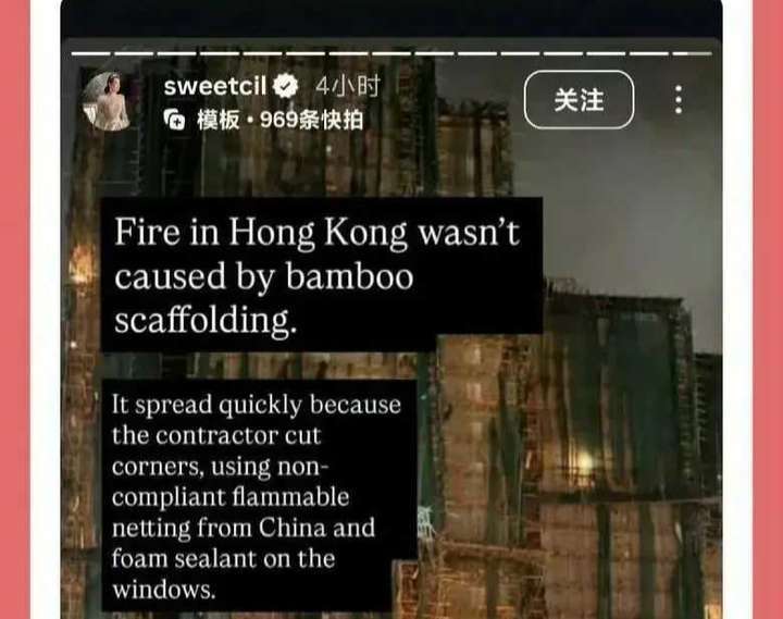 《看看新闻》等媒体11月29日报道称:11月28日,汪诗诗在外网的账号sweetcil(甜心)转发言论,称“香港的火灾不是由竹制脚手架引起的。火势迅速蔓延是因为承包商偷工减料,使用了来自中国的不合规易燃网布和窗户上的泡沫密封剂。”