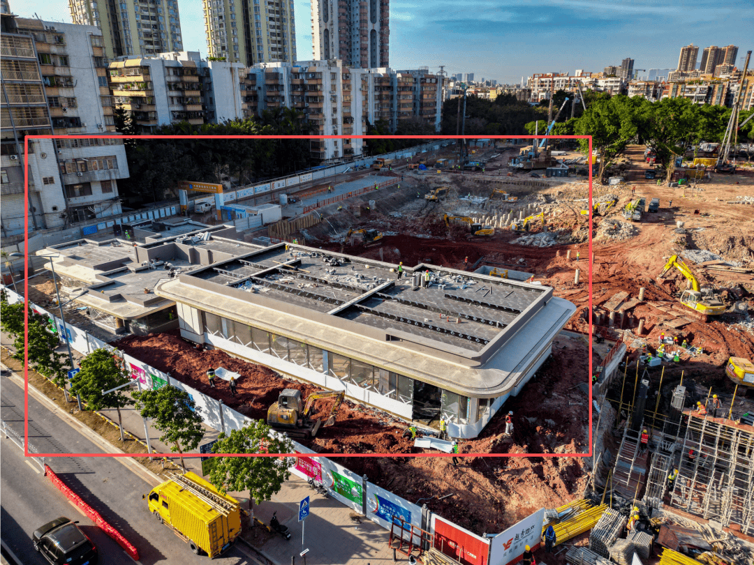 有熟悉工程的朋友告诉我,越秀是借用了项目前方公园用地去做临时售楼部与板房,不需要挖基坑、建地下室,建设速度就能跑起来。