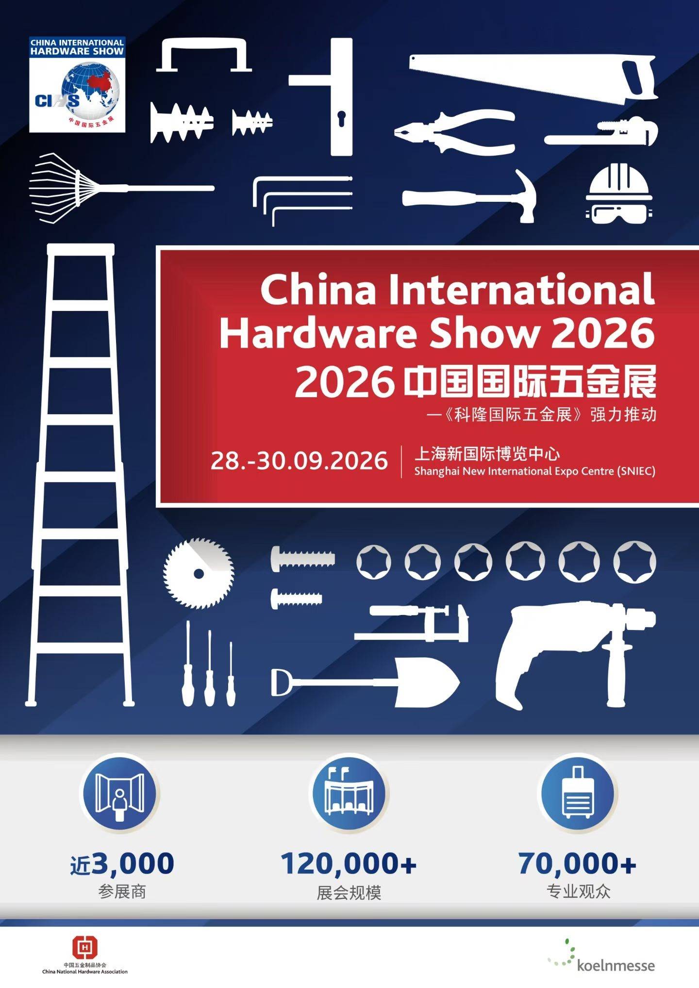 作为亚洲五金行业的旗舰展,2026中国国际五金展(CIHS)将于2026年9月28—30日在上海新国际博览中心(SNIEC)举办。展会由中国五金制品协会与德国科隆博览会有限公司(Koelnmesse)联合主办,承袭EISENWARENMESSE(科隆国际五金博览会)的全球资源与专业标准,长期被视为中国五金行业的“风向标”。本届展会预计规模120,000+平方米、参展企业近3,000家、专业观众70,000+,继续打造贯通全产业链的一站式商贸与技术交流平台。