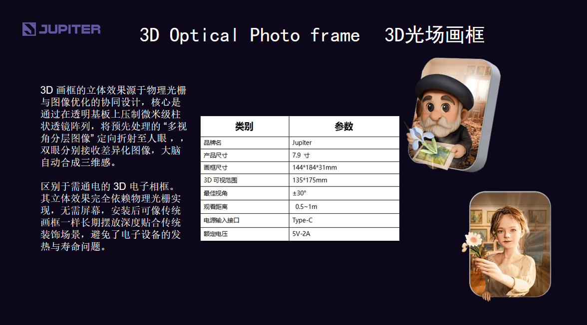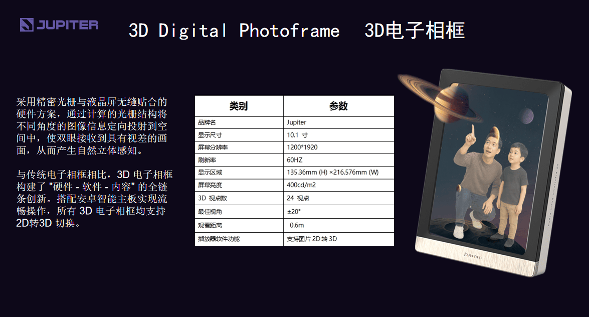 苏州智聚芯联(Jupiter)近日推出10.1英寸3D电子相框,通过精密光栅与液晶屏的无缝贴合技术,实现2D到3D的智能切换,为用户打造沉浸式影像体验。该产品支持24视点立体渲染,搭配400cd/m²亮度与±20°广视角,0.6米观看距离下即可呈现自然景深效果,重新定义家庭照片展示方式。