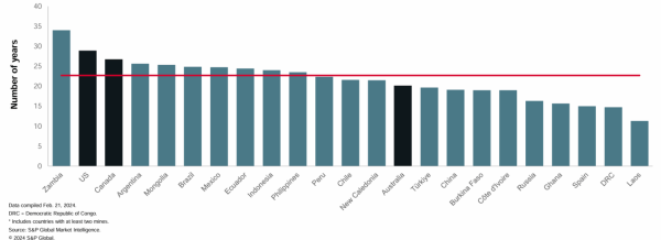 横向比较各国矿产开发的平均周期,美国“屈居”赞比亚。数据来源:标普全球市场情报公司。