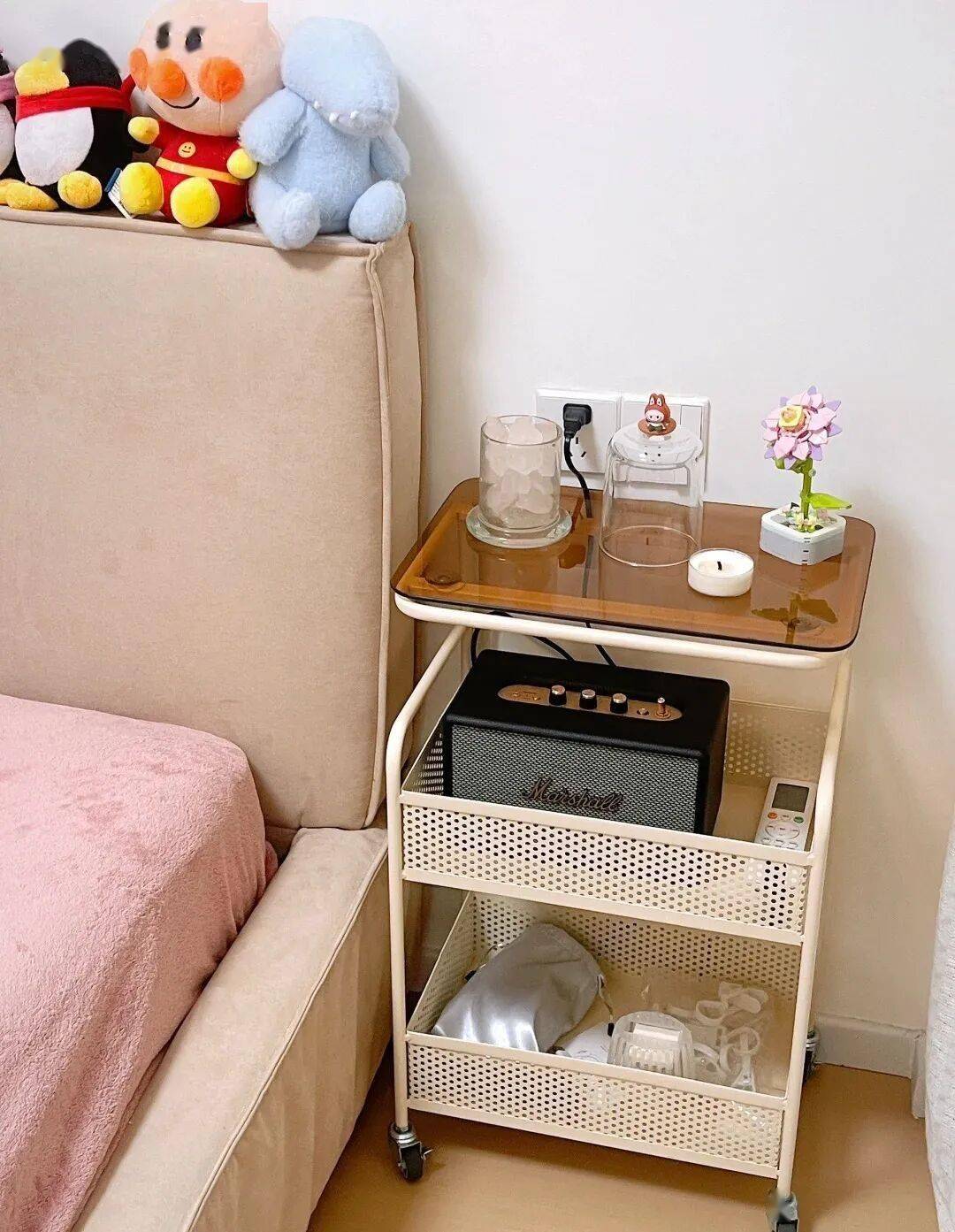 带滑轮的小推车,堪称现在年轻人替代床头柜的神器,不仅灵活机动,而且收纳力强,三层空间足以容纳日常的零食、饮料,台面放点睡前物品也是轻松松松,最重要的是,因为底下带滑轮设计,打扫的时候可以轻松挪开,方便又快捷。