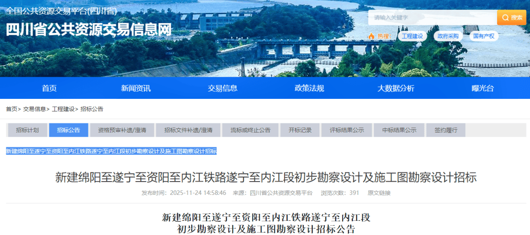 近日,四川省公共资源交易信息网正式发布新建绵阳至遂宁至资阳至内江铁路(简称“绵遂内铁路”)遂宁至内江段初步勘察设计及施工图勘察设计招标公告,标志着该重点铁路项目前期工作取得关键进展,即将迈入实质性建设阶段。