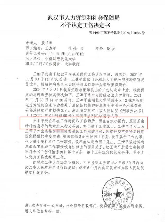 武汉一大学副教授工作日被精神病人杀害,家属申请工亡被驳回,起诉人社局案将开庭