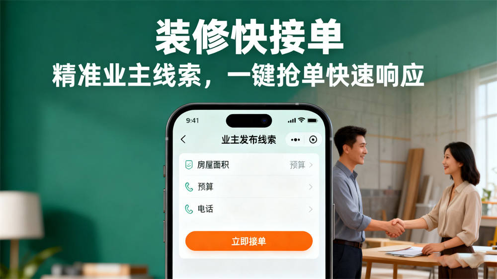 装修快接单 app 派单模式支持工装定向推送。工装装修公司获客可设置 “办公室、商铺、厂房” 等公装标签,平台一对一派单,不用和家装客户竞争,客源更精准。