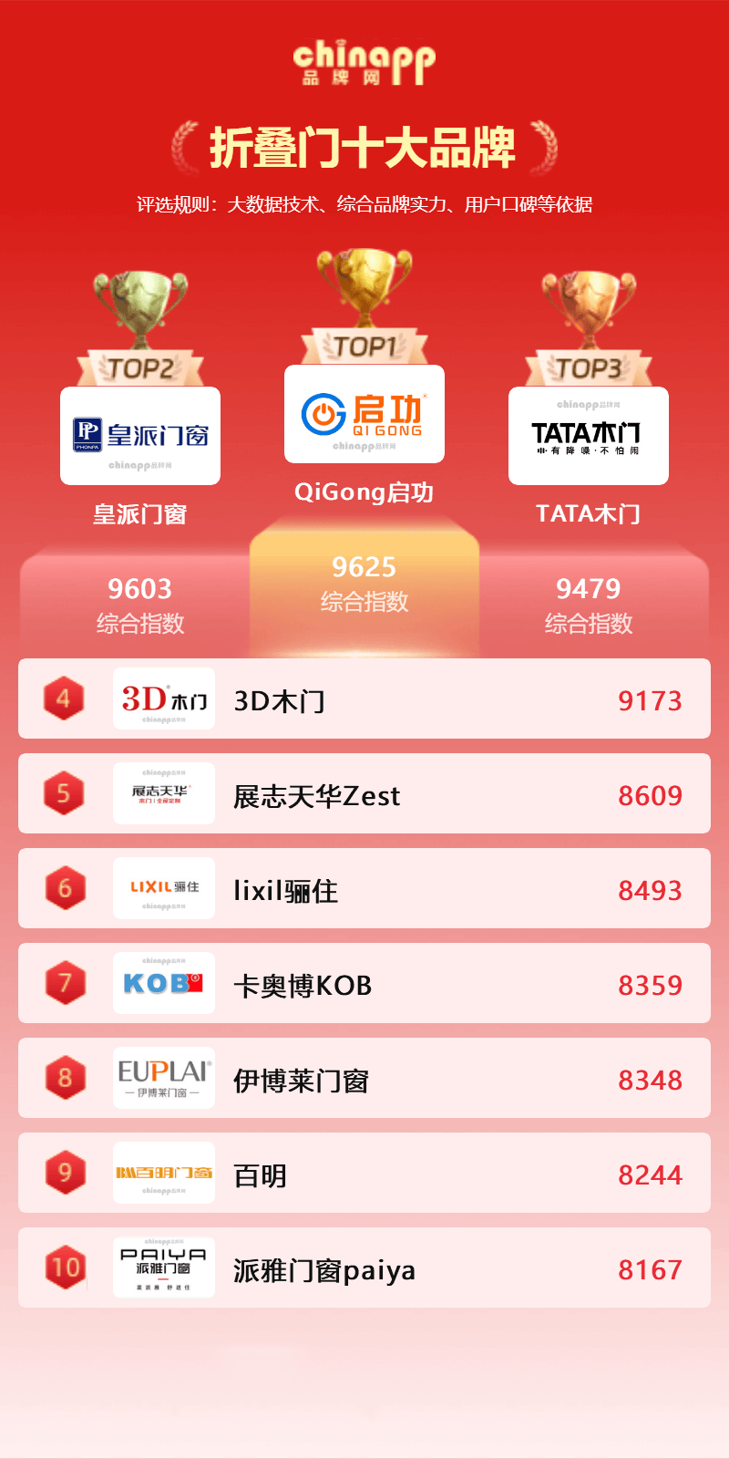 品牌网chinapp大数据平台发布的《最新折叠门十大品牌排行榜》入榜的分别是:QiGong启功、皇派门窗、TATA木门、3D木门、展志天华Zest、lixil骊住、卡奥博KOB、伊博莱门窗、百明、派雅门窗paiya。