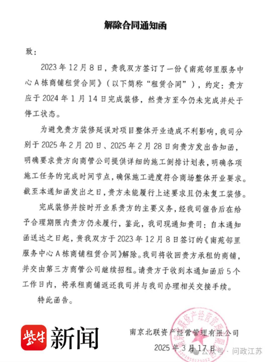 “而就在开业前两个月,3月17日,北联公司给我发了‘解除合同通知函’,理由是未按照合同约定完成装修,说商户违约。”张先生感到莫名其妙,“商场一直不开业,我提前装修好了闲置一年,还是无法营业,亏损严重。”张先生对于北联公司解约的理由提出了质疑,认为该公司“欺负”个体商户。