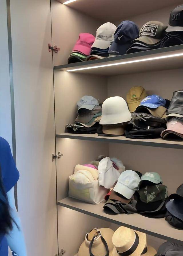 帽子区的情况同样夸张。同款或同系列的帽子叠在一起放满整个抽屉或隔板,渔夫帽、棒球帽、贝雷帽、毛线帽各种材质都有,颜色也以基础色为主,便于日常百搭。打开柜门时能看到整摞整摞的帽子码得整整齐齐,像专卖店的货架补充区。