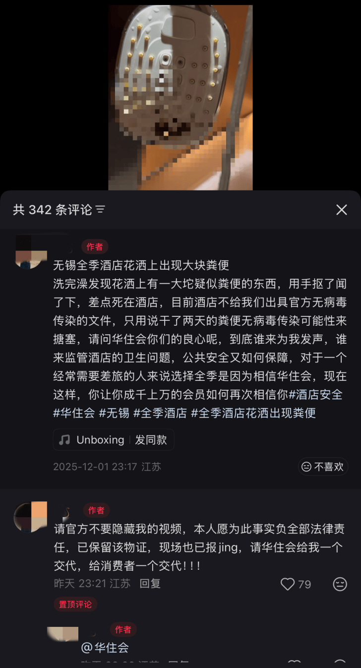 12月2日消息,有网友发帖称,她和家人入住江苏无锡一家全季酒店,洗完澡后发现花洒上有大便,此事引发网友热议关注。