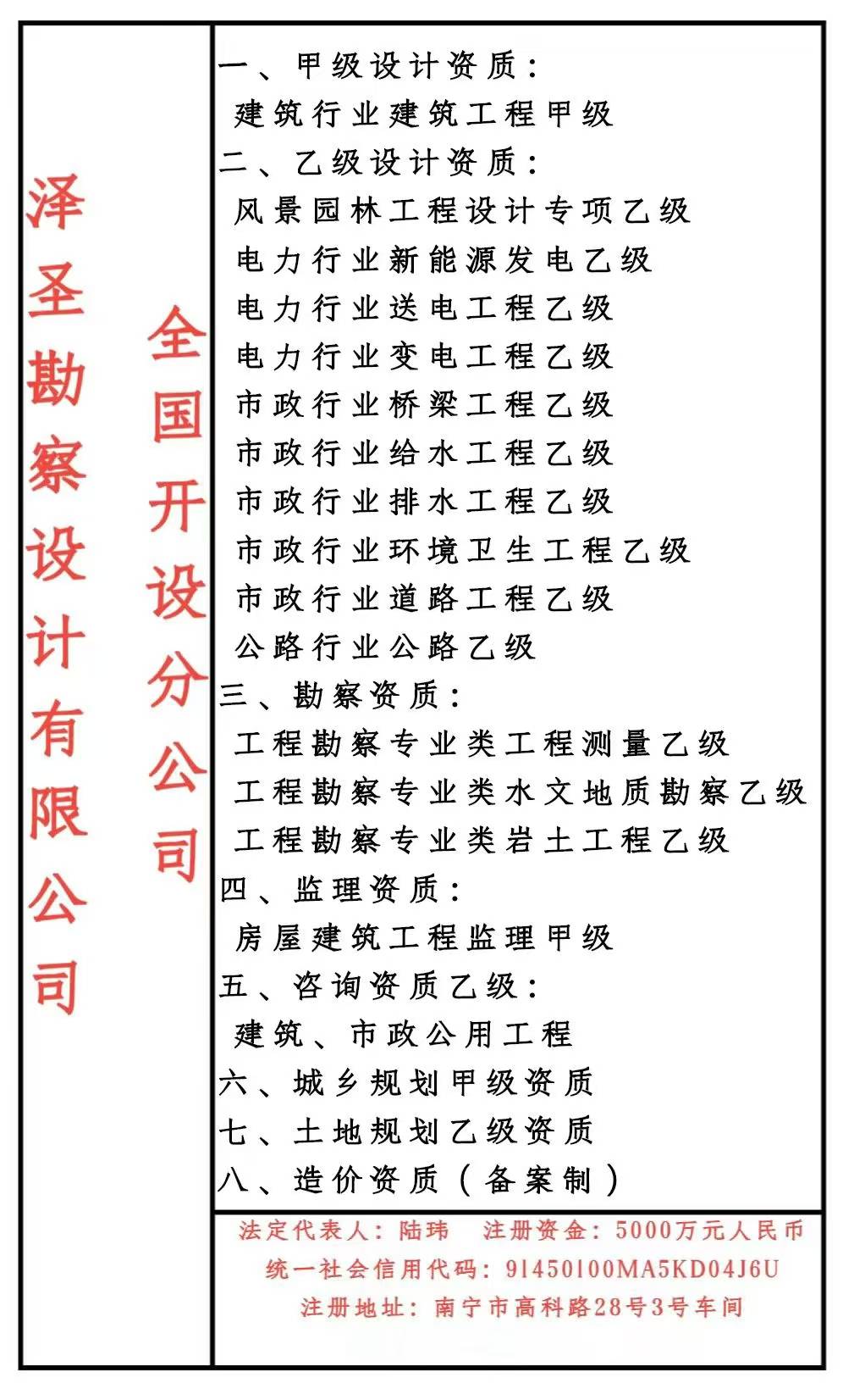 泽圣勘察设计有限公司成立于2016-06-23,法定代表人为陆玮,注册资本为5000万元,1851~4491~776,统一社会信用代码为91450100MA5KD04J6U,企业注册地址位于南宁市高科路,所属行业为专业技术服务业。