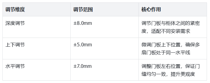 这种全面的调节能力,让安装师傅在装上门板后,仍能进行精细校正,最终实现所有柜门横平竖直、缝隙均匀的完美安装效果。