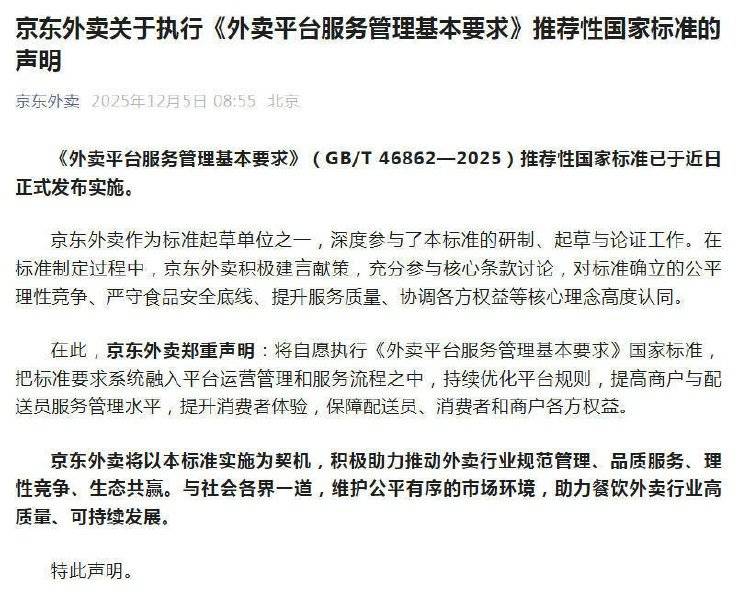 近日,淘宝闪购、美团、京东外卖相继发布执行《外卖平台服务管理基本要求》推荐性国家标准的声明。