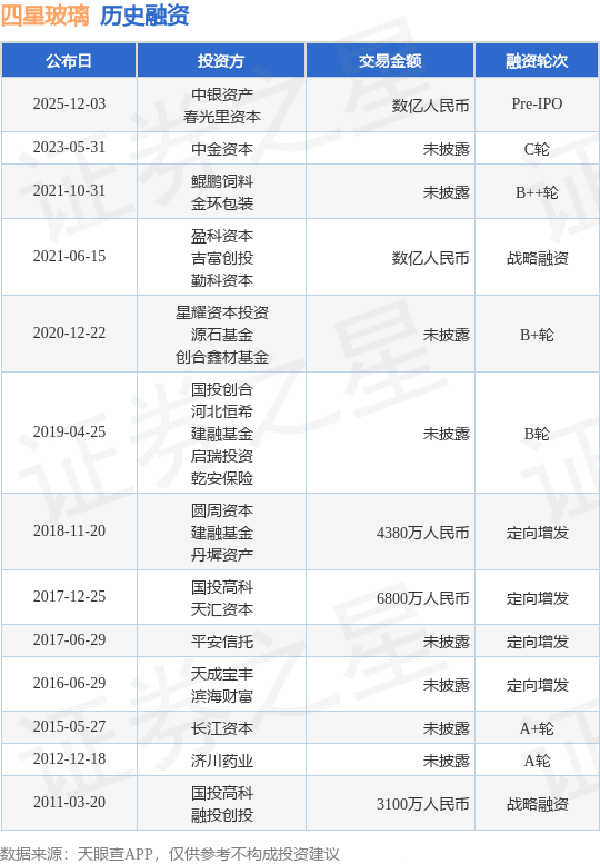 证券之星消息,根据天眼查APP于12月3日公布的信息整理,沧州四星玻璃股份有限公司Pre-IPO融资,融资额数亿人民币,参与投资的机构包括中银资产,春光里资本。