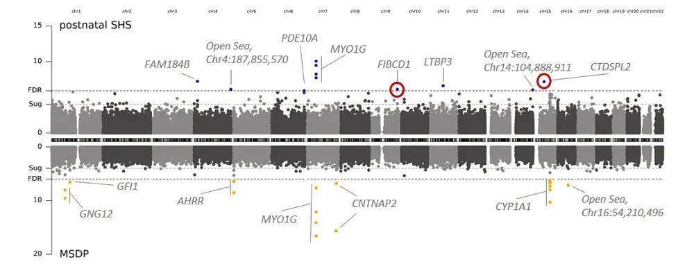 孩子生活在有人吸烟的家庭里,会在基因调控层面留下11个明确的“烟雾痕迹”。这些点在图中的上半部分以蓝点的形式突出显示,其中两个是科学界从未见过的新标记。下半部分的橙点是大家熟悉的孕期吸烟带来的变化,用来说明分析是可靠的。这张基因地图得以让我们直观地看到烟雾在孩子体内留下的痕迹在哪里。