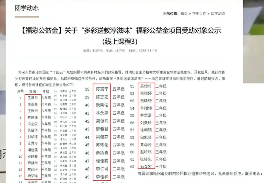 据悉,该校的福彩公益金项目名为“多彩送教淳滋味”——浙江省淳安县助困助学项目,几则受助对象公示分别发布于2022年及2023年。