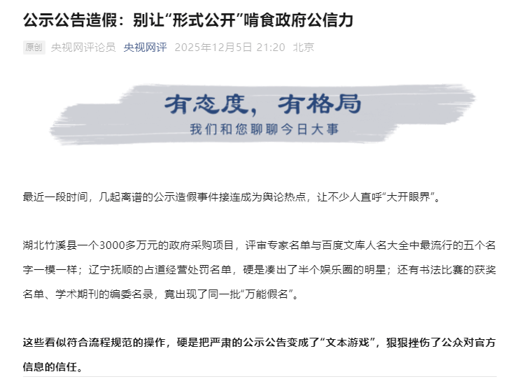 更可怕的是,这种“形式公开”很可能成为腐败的遮羞布——采购名单造假可能是为了给关系户开绿灯,处罚名单造假或许是为了掩盖执法缺位,赛事名单造假没准是想借机敛财,最终受损的都是公共利益和群众权益。
