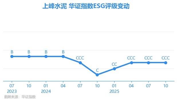 日前,华证指数公布了新一期(2025年10月31日)的ESG评级结果,上峰水泥(000672.SZ)获得CCC评级(华证指数评级为C起至AAA九档,C为最低档,AAA为其最高一级评级/AA为其第二档),上一期(2025年7月31日)ESG评级为CCC。本期ESG评级在43家建筑材料行业A股上市公司中排名第22(上一期排名第23)。
