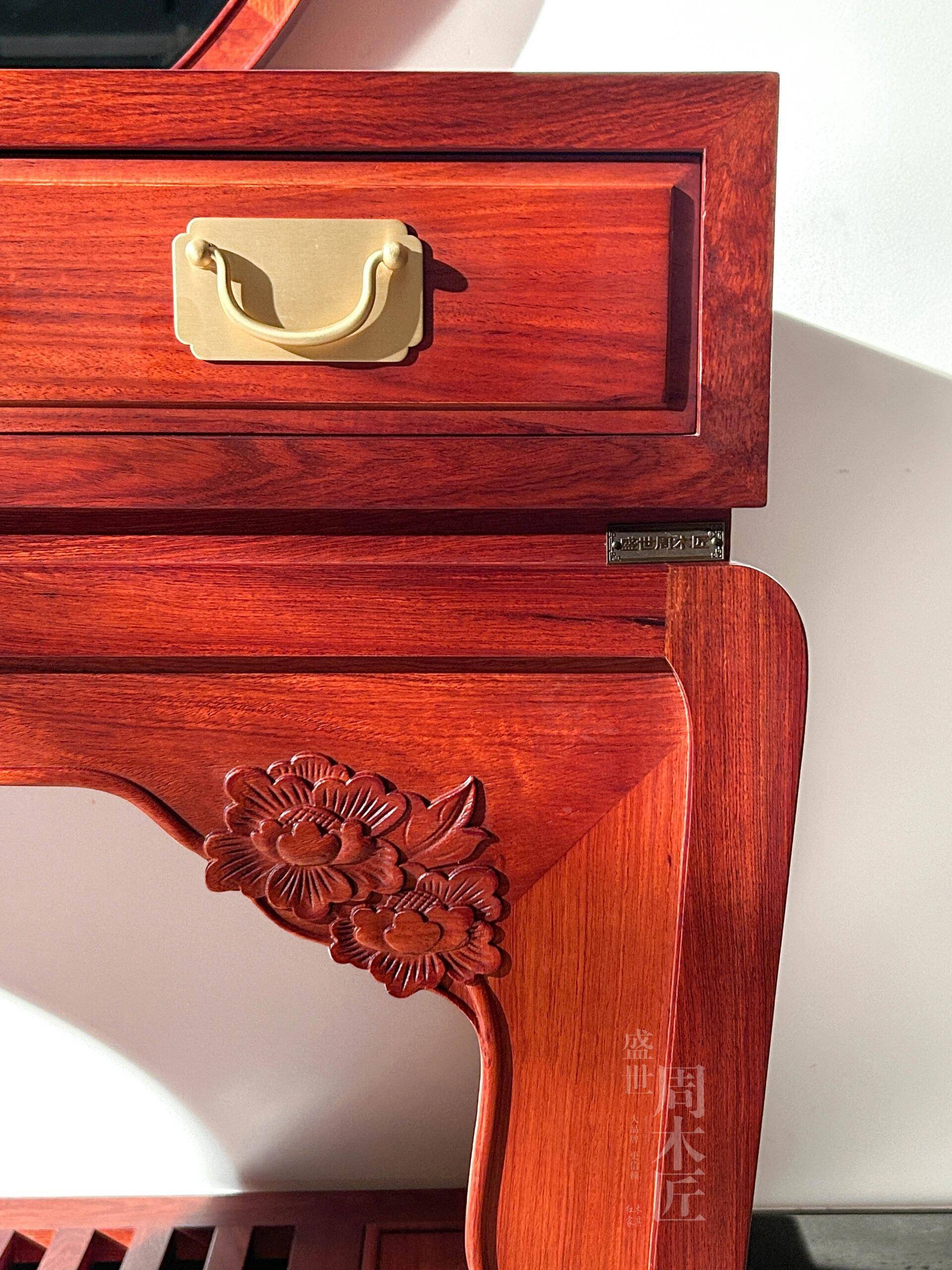 选择红木梳妆台时,材质是关键。刺猬紫檀和大果紫檀是两种常见的优质红木材料。刺猬紫檀纹理多样且稳定性好,适合南北各地使用;而大果紫檀则带有淡淡的果香味,纹理丰富,如水波纹和虎皮纹,是性价比高的高端选择。购买时,可以轻轻敲击木材,听其声音是否清脆,以此判断木材的密度和质量。
