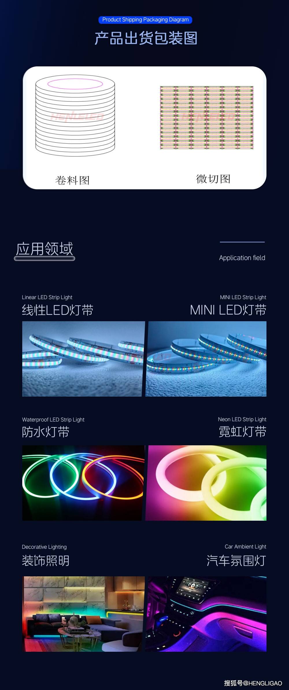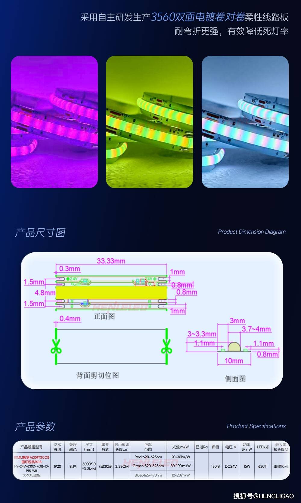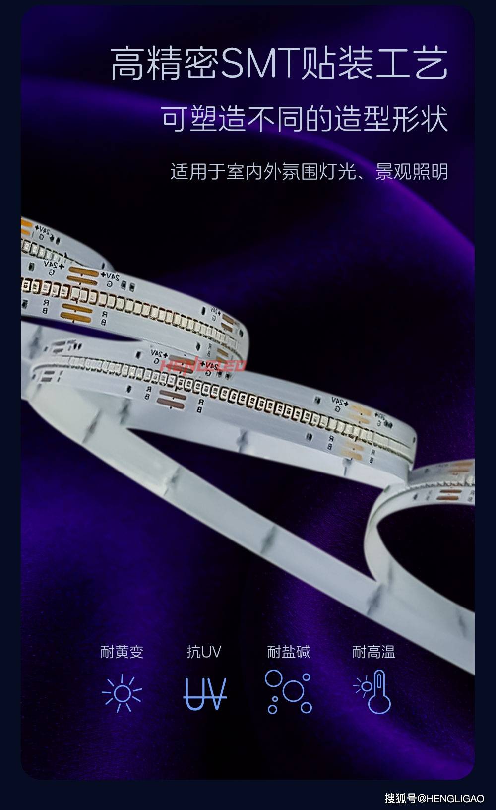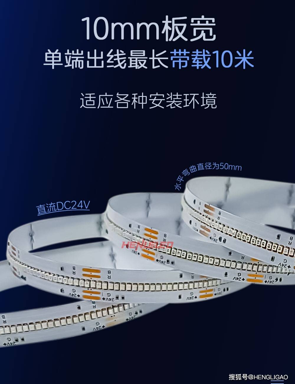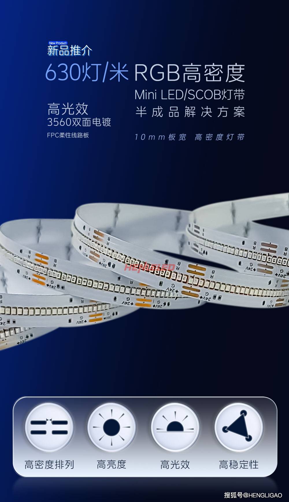 恒立高科技(深圳)有限公司新品上市|10mm板宽 630灯/米 七彩RGB高密度围坝拉胶SCOB LED灯带半成品解决方案,采用自主研发高光效3560双面电镀FPC柔性线路板,630灯/米 MINI LED小灯珠,围坝拉胶,高高密度排列,高亮度,高光效,高稳定性;采用直流DC24V,10mm板宽,可水平弯曲,弯曲直径为50mm,单端出线最长带载10米,满足各种安装环境;产品具有柔性好,抗弯折,混光均匀,无光斑,支持定制LED灯珠密度满足不同环境灯光需求;产品耐黄变,抗UV,耐盐碱,耐高温,可以塑造不同的造型形状,适用于室内外氛围灯光、景观照明。