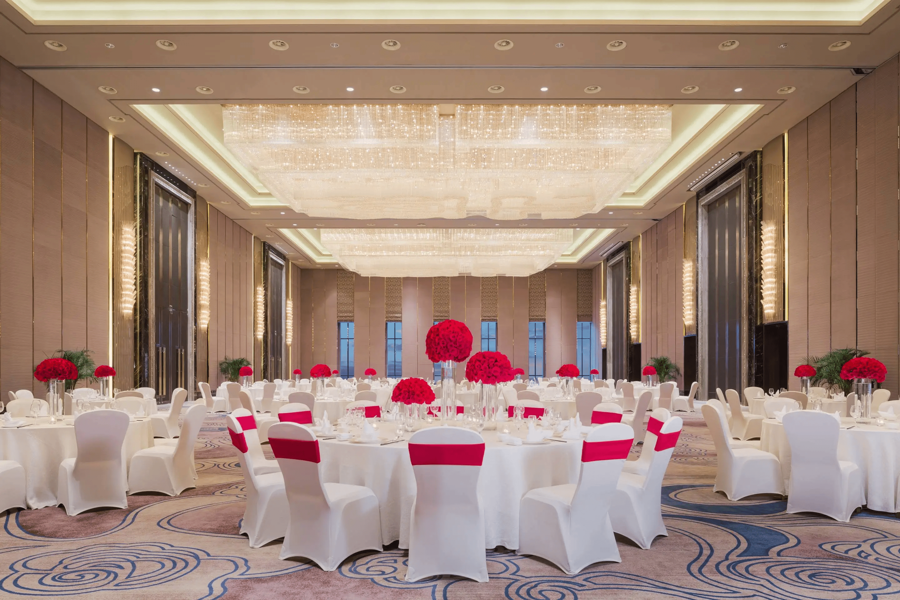 - 空间尺寸需合理规划:主宴会厅净高不低于3.5m(避免压抑,方便搭建舞台、悬挂灯光音响);餐桌摆放间距不小于0.8m,过道宽度不小于1.5m,保证人员通行和餐车推送顺畅。