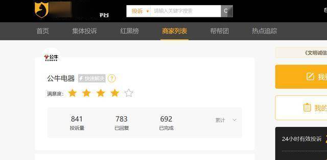 据黑猫投诉平台显示,公牛电器累计投诉量为841条,已完成692条。