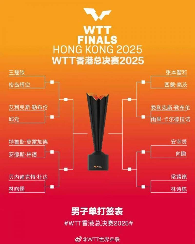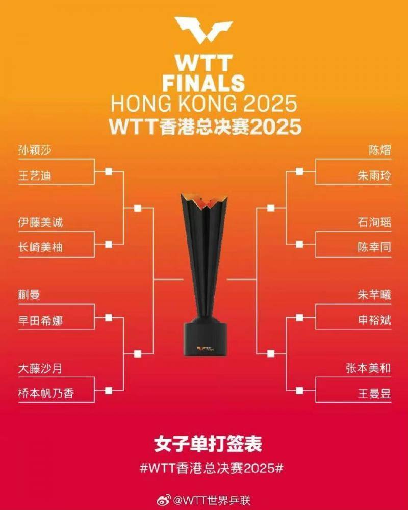 WTT香港总决赛2025将于12月10日至14日在中国香港红磡体育馆举行。8日下午,本届赛事进行了抽签。女单方面,卫冕冠军王曼昱首轮对阵日本球员张本美和,世界第一孙颖莎首轮迎战队友王艺迪;男单方面,王楚钦一人处在上半区,他首轮将对阵日本选手松岛辉空。